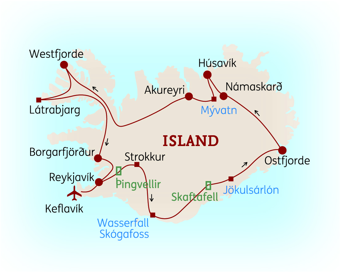 steht auf dem Programm, geologisch mit den Westfjorden der älteste Teil des Landes. Bei gutem Wetter fahren Sie zunächst auf die Passhöhe Almannaskarð, wo sich Ihnen ein fantastischer Blick auf den Gletscher Vatnajökull bietet. Im Anschluss geht es weiter durch unberührte Landschaften entlang der Ostfjorde bis zum Dorf Djúpivogur, wo Sie sich bei einem für die Region typischen Mittagssnack stärken. 1 Nacht im Raum Egilsstaðir. (F/M)