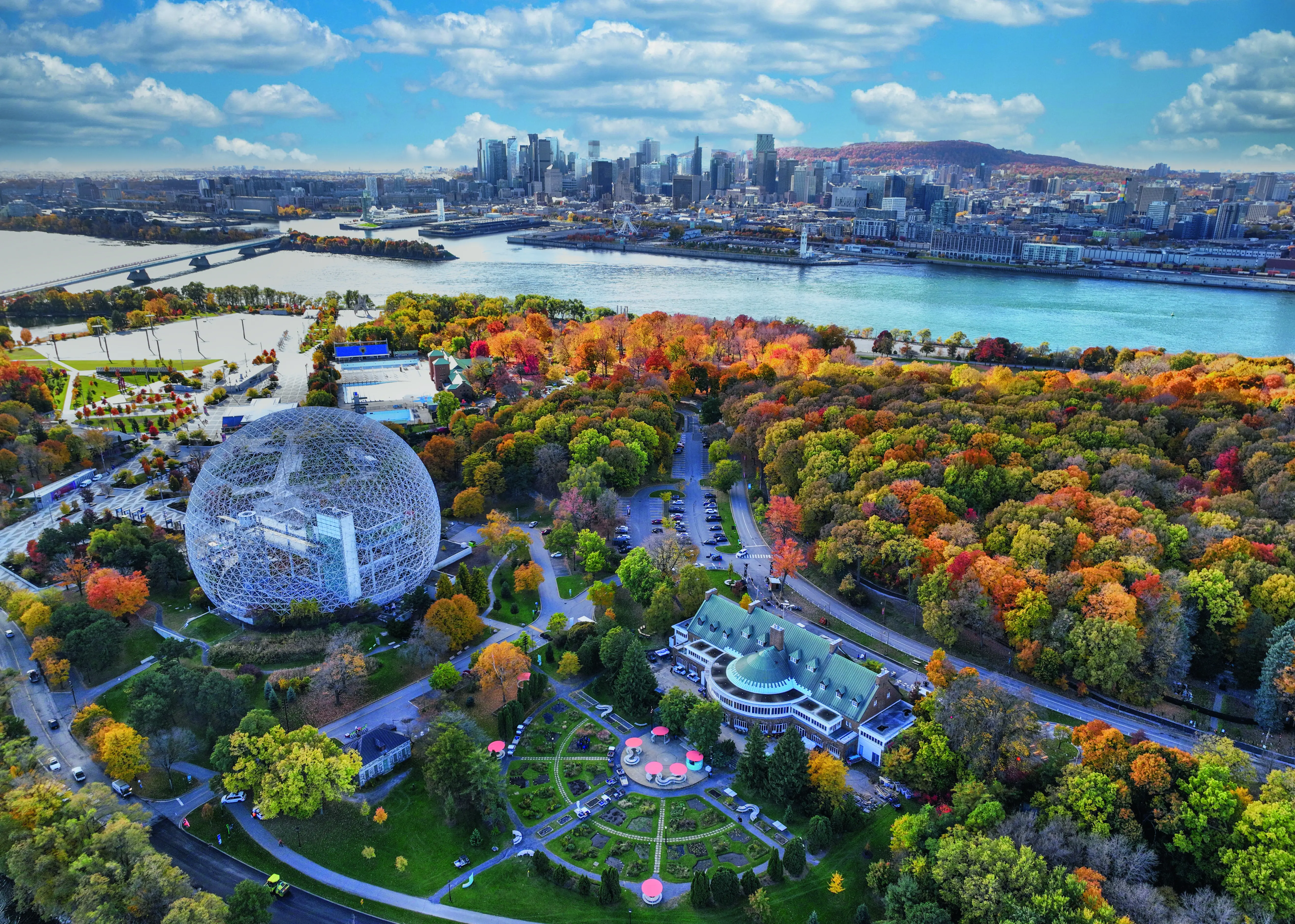 Luftaufnahme eines Parks mit buntem Laub, einem runden Glaskonstruktion und einer Stadtansicht im Hintergrund.