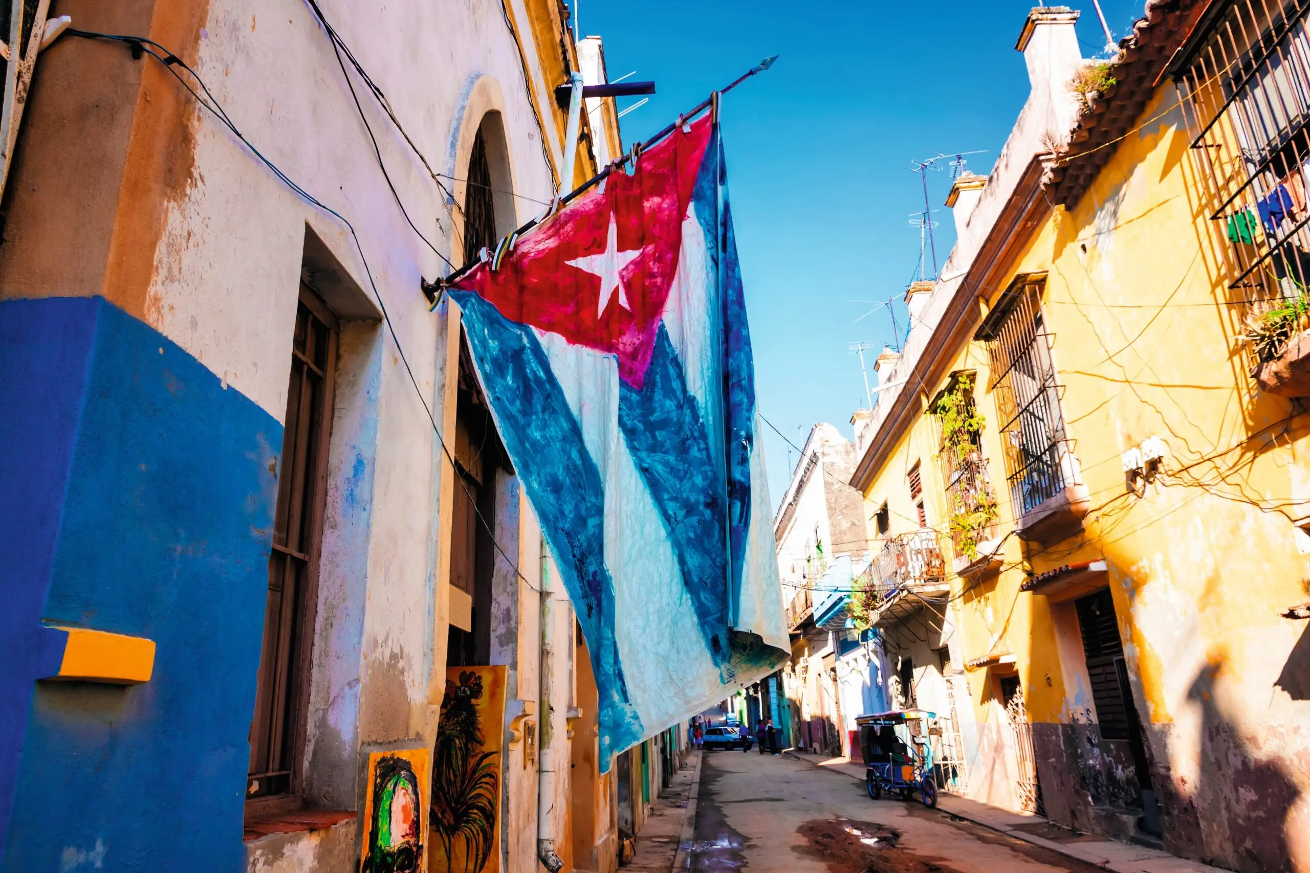 Cuban flag hanging between buildings in a colorful street in Havanna.