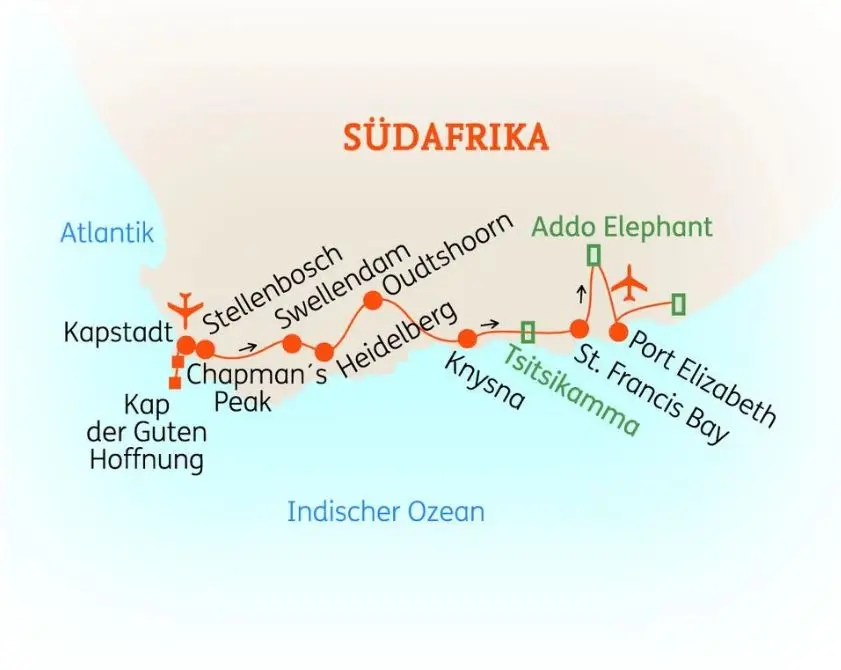 Ihre Reise beginnt mit einem Flug nach Kapstadt.