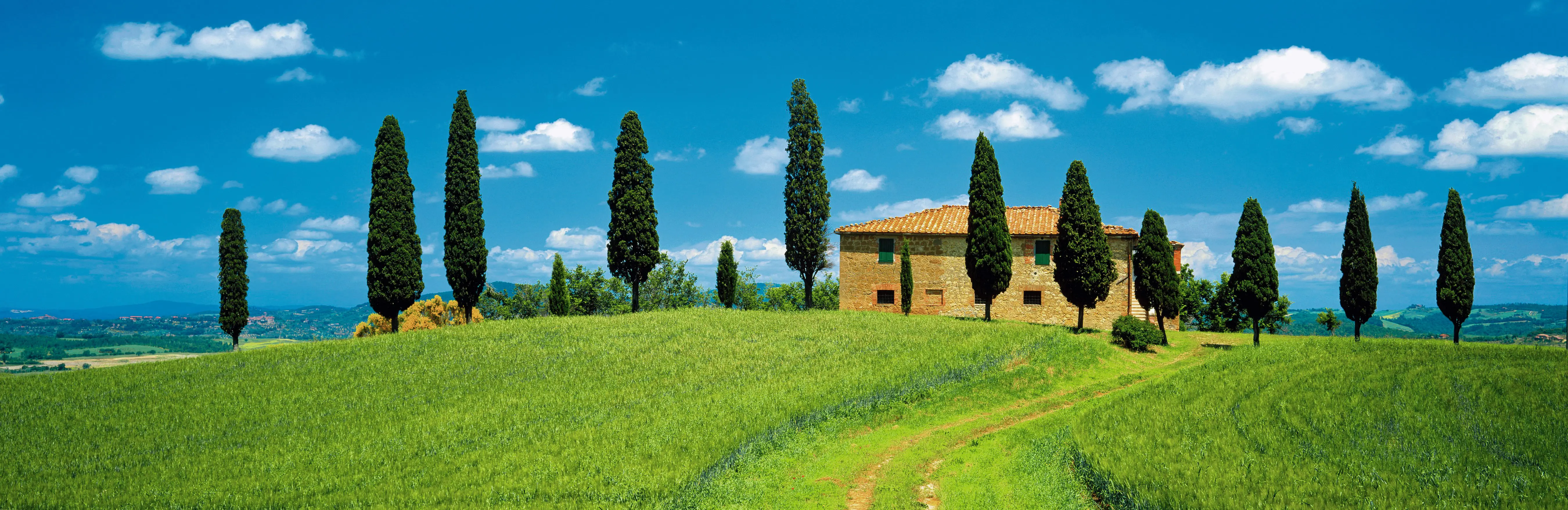 Landschaft mit einem traditionellen italienischen Landhaus umgeben von Zypressen und blauen Himmel mit Wolken.